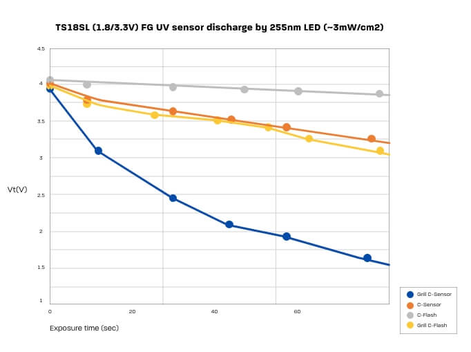 Fig. 2 demonstrates UVC (255nm) sensitivity of a solar-blind Grilled C-sensor, one of the flavors of C-Flash NVM developed in the company.